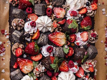 Strawberries, cookies, fine chocolates, marshmallows, and chocolate wafers served on a covered disposable tray.