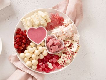 Charcuterie bites and sweets, all tucked in a wrapped bundle of love and served in an elegant white box—just like flowers, but better!