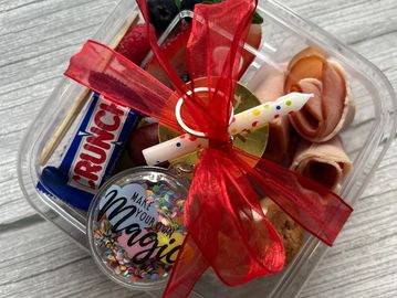 Boars head turkey or ham; American cheese; seasonal fruit; mini water, sweet treat; crackers and a fun prize! (Vegan available)