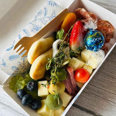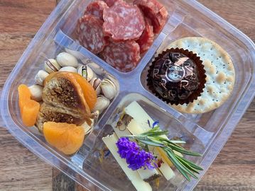 Small Lunchbox: 2 artisan cheese, 2 cured meats, veggie, fruit, marmalade spread: chocolate, and specialty crackers.