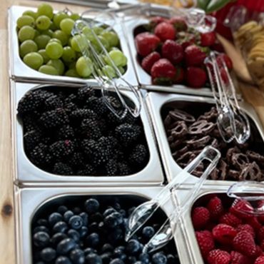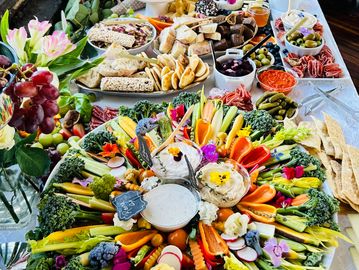 Serves groups of 25 and up plus as an appetizer. We strongly recommend your table be indoors during the hot weather months. Your table will also be decorated with light fresh flowers & greenery. NOTE: Set up on premises up to 2-3 hours before your event starts and return same or next day to pick up items used to create your display. $17 per person includes small disposable plates and serving spoons and tongs. For beautifully crafted boards, we invite you to explore our website.