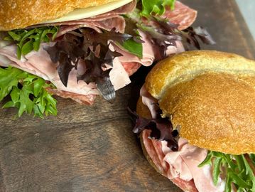 Italian Salami; sandwich pepperoni; genoa salami; fresh mozzarella cheese; mixed greens; aioli mayo; roasted red peppers, on an artisan roll.