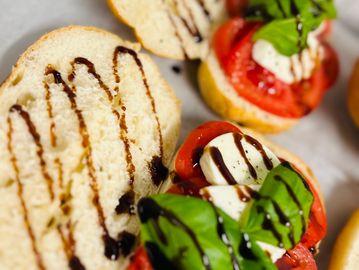 Fresh mozzarella cheese, Roma tomatoes, fresh basil, extra virgin olive oil and balsamic glaze on an artisan roll