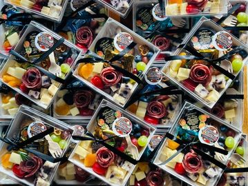 5 artisan cheese, 5 cured meats; olives, seasonal fruit, seasonal veggies; hummus/dip, chocolates, jam or jelly, assorted specialty crackers on the side: Prepared in a disposable box and transfer on a flat lay table. We deliver and set up for you- within 10 miles of Geneva.