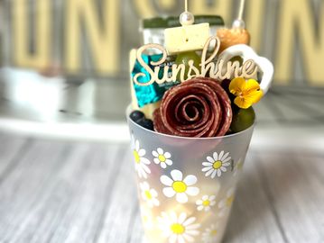 A plastic re-useable cup filled with crackers, cured meats, artisan cheese and accoutrements. Add a note for an additional $1.50